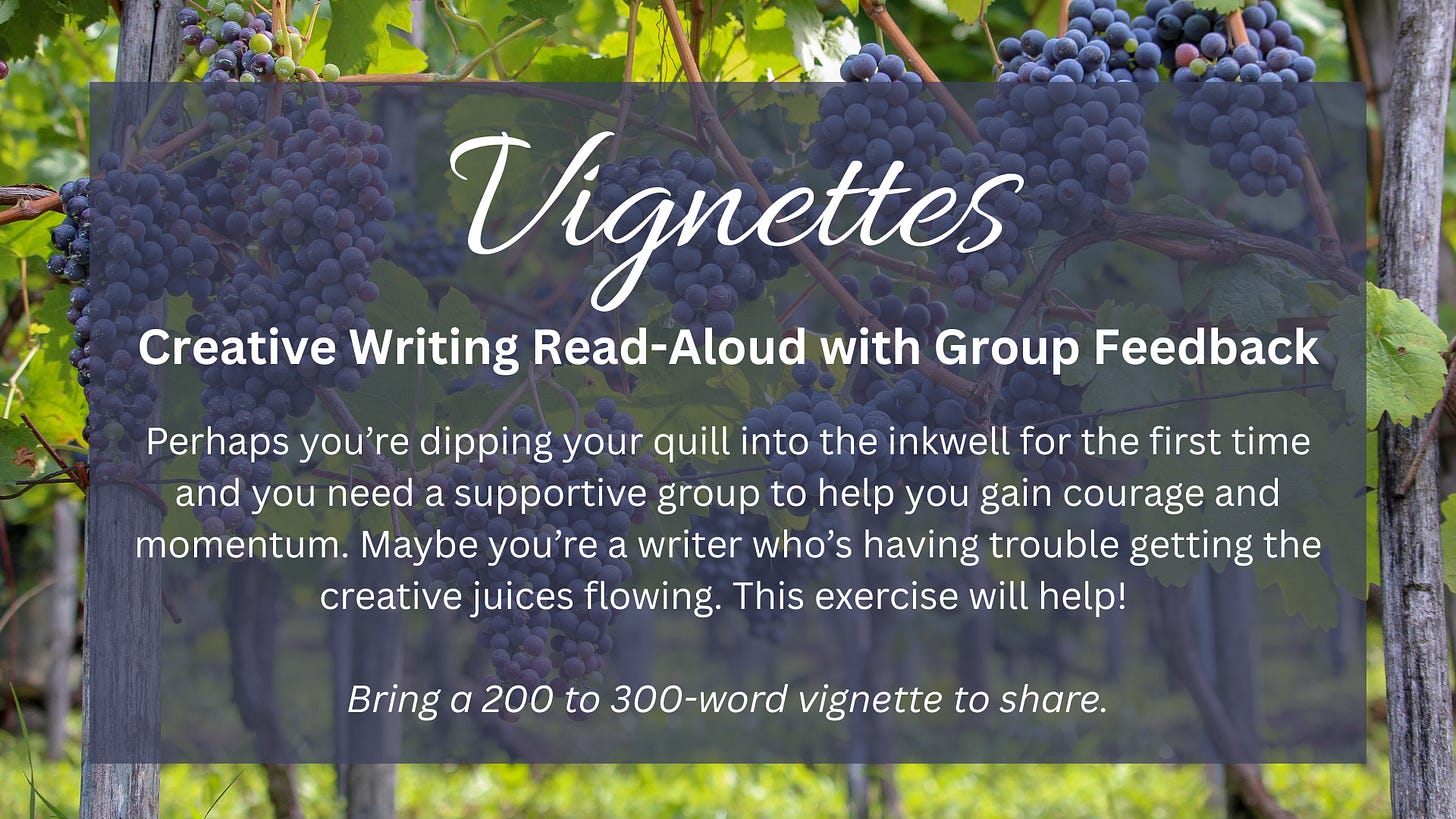 Vignettes meets on a Saturday morning by Zoom every other month. Participants bring a portion of a work-in-progress or a fresh, 200 to 300-word vignette to share aloud, and everyone offers honest, constructive feedback. Upcoming meeting dates and Zoom links are sent to paid subscribers through Substack chat.